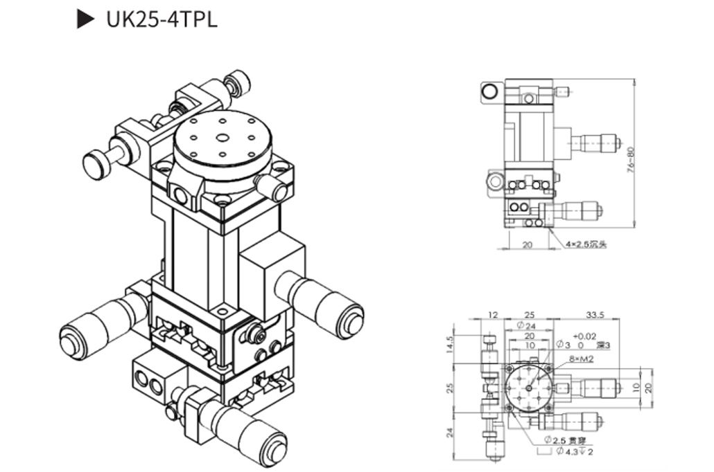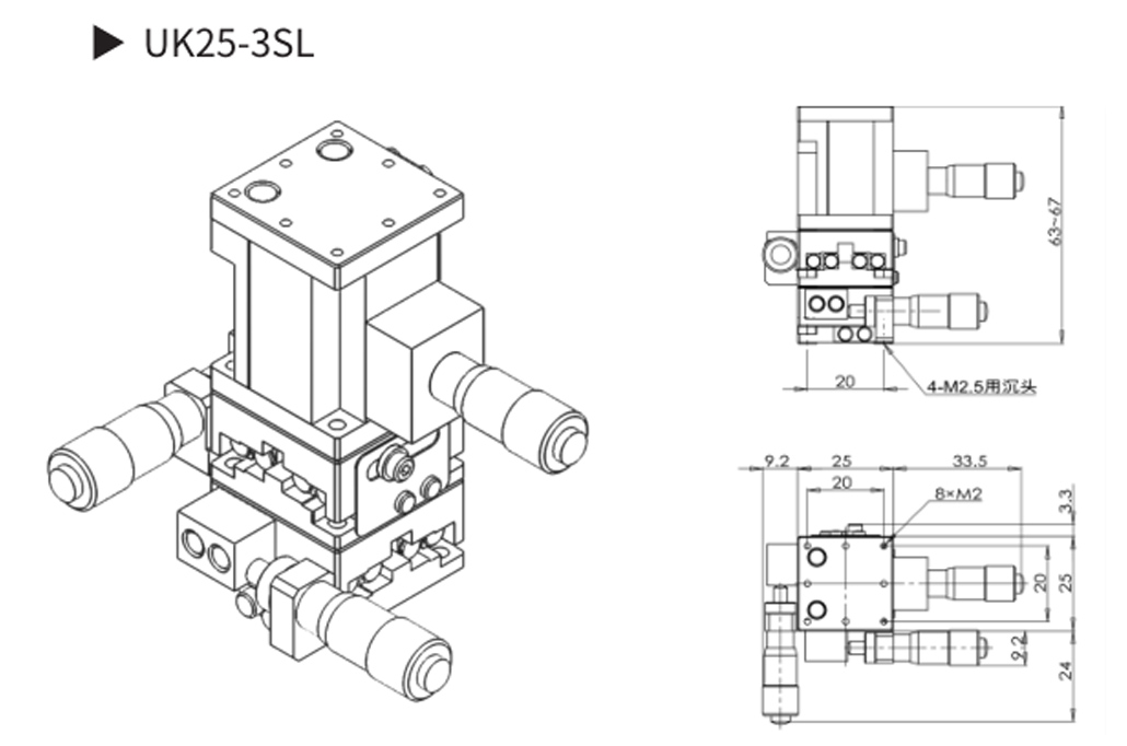 UK25 系列多维组合式手动滑台▶ X、Y、Z 三 维 调 节, 行 程:X、Y 轴 ±3.25mm,Z 轴 4mm;