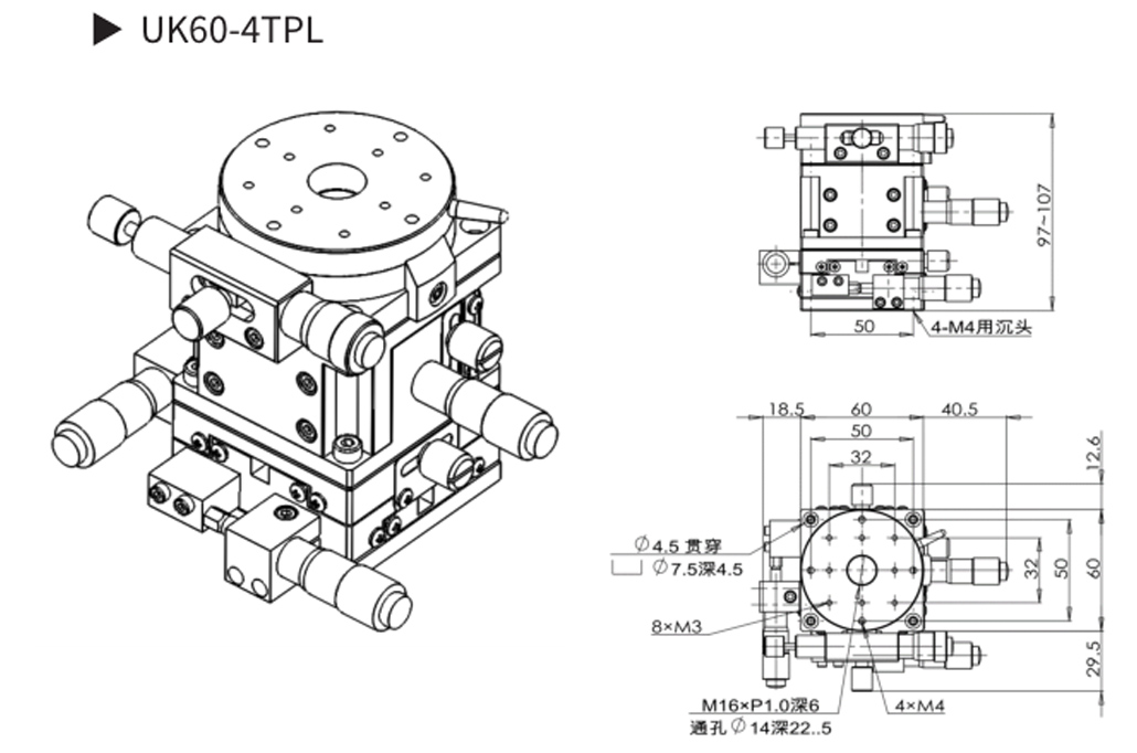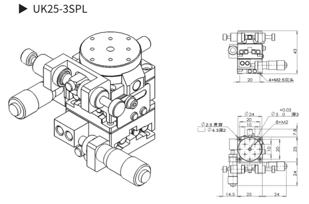UK25 系列多维组合式手动滑台▶X、Y、θZ 三 维 调 节, 行 程:X、Y 轴 ±3.25mm,θZ 轴 360°粗调,±3°精调;