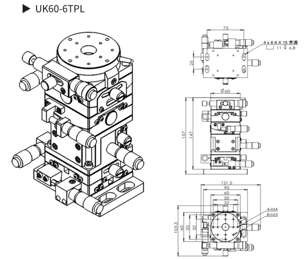UK60 系列多维组合式手动滑台▶ X、Y、Z、θZ 四 维 调 节, 行 程:X、Y 轴 ±6.5mm,Z 轴 10mm,θZ 轴 360°粗调, ±5°精调;